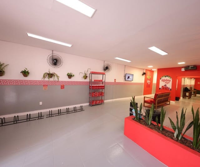 No Ponto de Apoio, os entregadores contam com uma estrutura completa para facilitar o dia a dia: copa equipada com pia, microondas, geladeira e bebedouro, além de espaço para descanso, ponto de recarga para celulares, mesa para refeições, TV e banheiros. O ambiente ainda valoriza a cultura local, com elementos de decoração produzidos por artesãos da região.