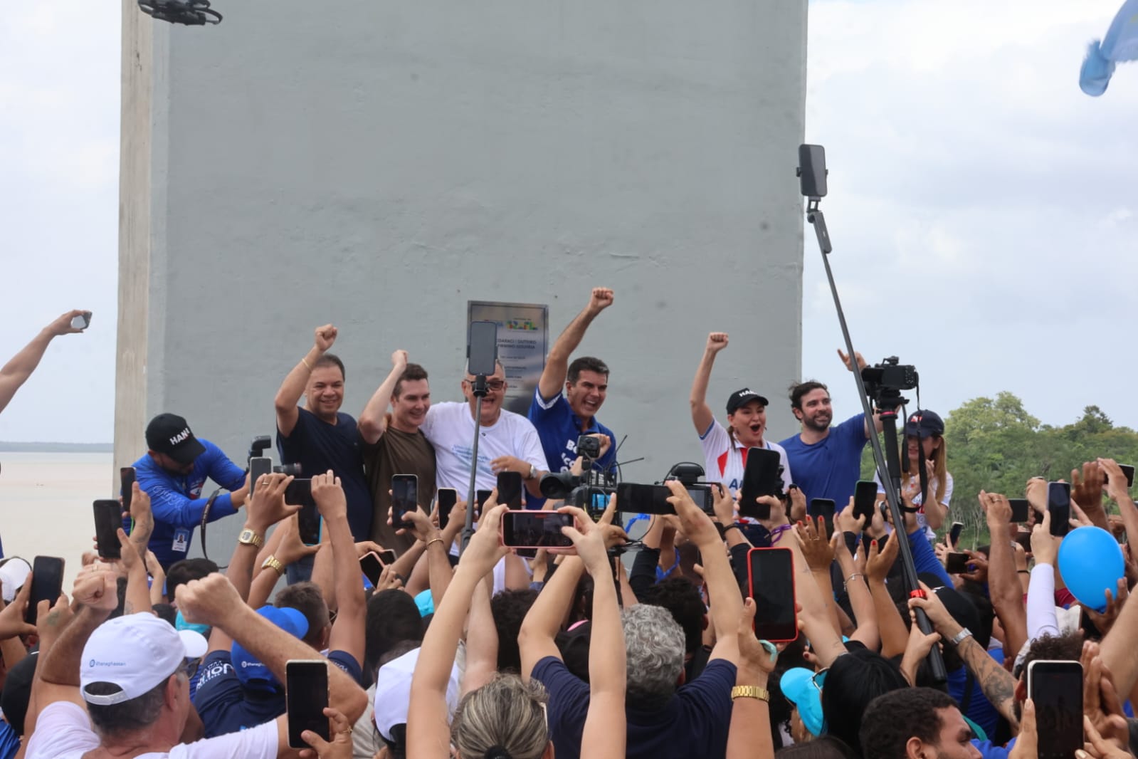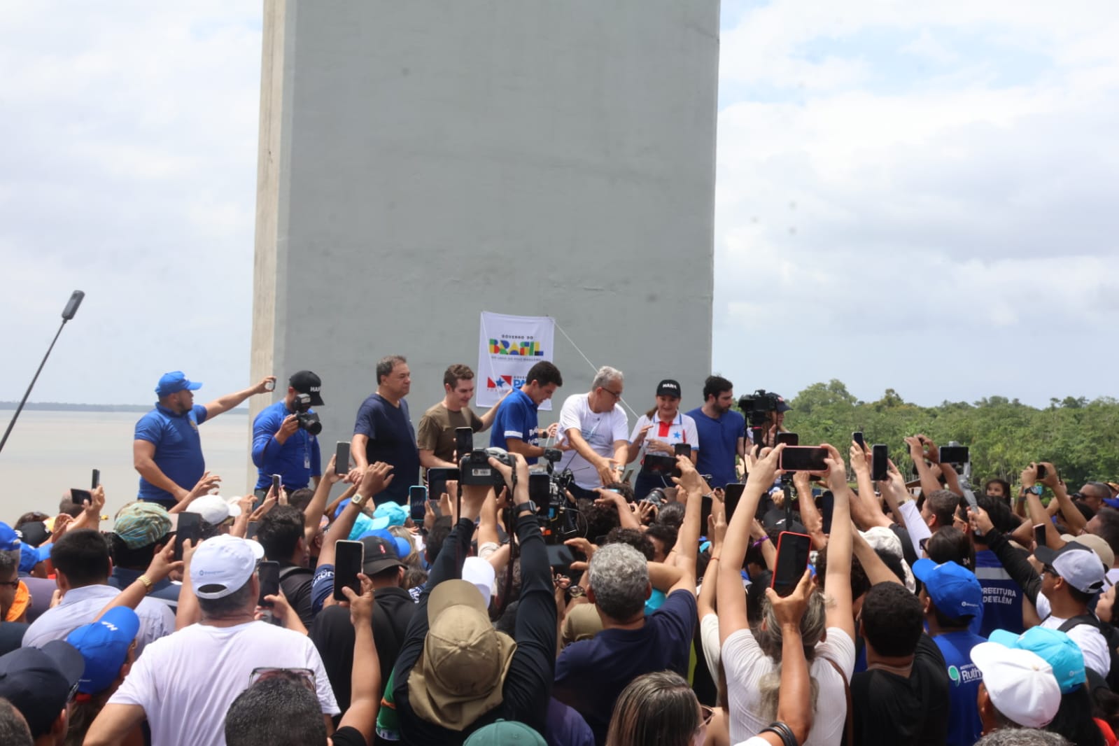Durante o discurso, o governador Helder Barbalho destacou o caráter histórico e simbólico da obra, lembrando que o local já abrigou pontes e travessias que marcaram gerações de moradores da região.