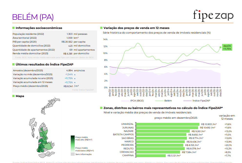 Entre as 56 cidades monitoradas pelo índice, nenhuma apresentou queda de preços no ano, e nas capitais os maiores saltos foram registrados em Salvador, João Pessoa, Vitória, São Luís e Fortaleza, enquanto Belém se posicionou logo atrás desse grupo, consolidando-se no pelotão de cima da valorização nacional. Em valores absolutos, o preço médio do metro quadrado na capital paraense chegou a R$ 8.341 em dezembro, abaixo da média nacional de R$ 9.611, o que ainda mantém a cidade competitiva para quem busca comprar, ao mesmo tempo em que evidencia espaço para novas altas.