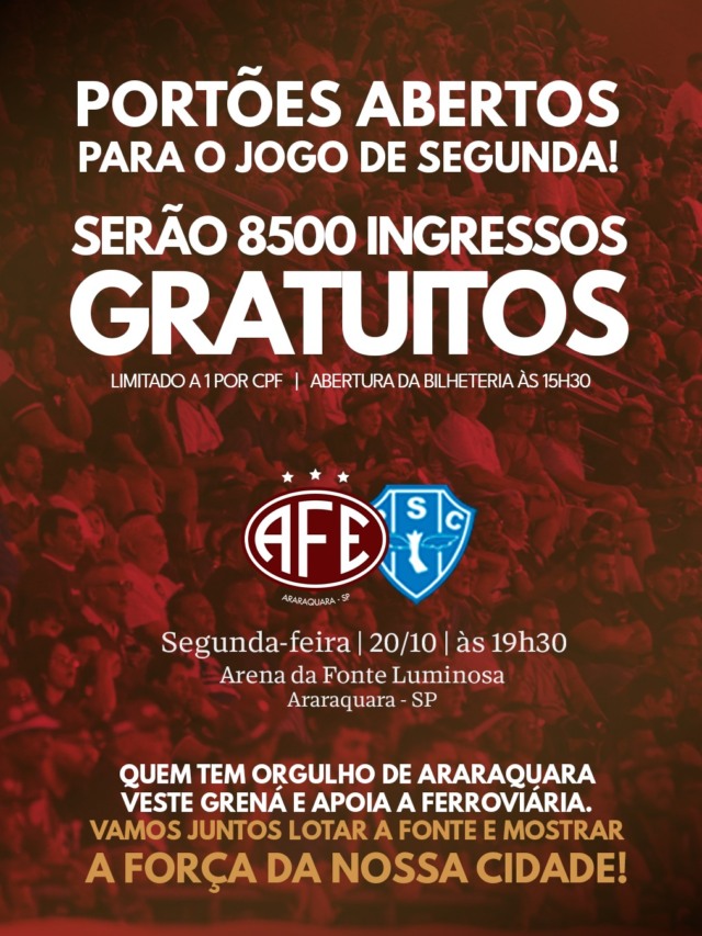 A Ferroviária anunciou nesta quinta-feira (16) que vai disponibilizar 9.500 ingressos gratuitos para sua torcida no jogo contra o Paysandu, que acontece na noite da próxima segunda-feira (21), pela 33ª rodada da Série B do Campeonato Brasileiro.
