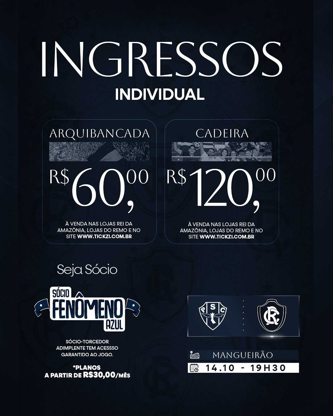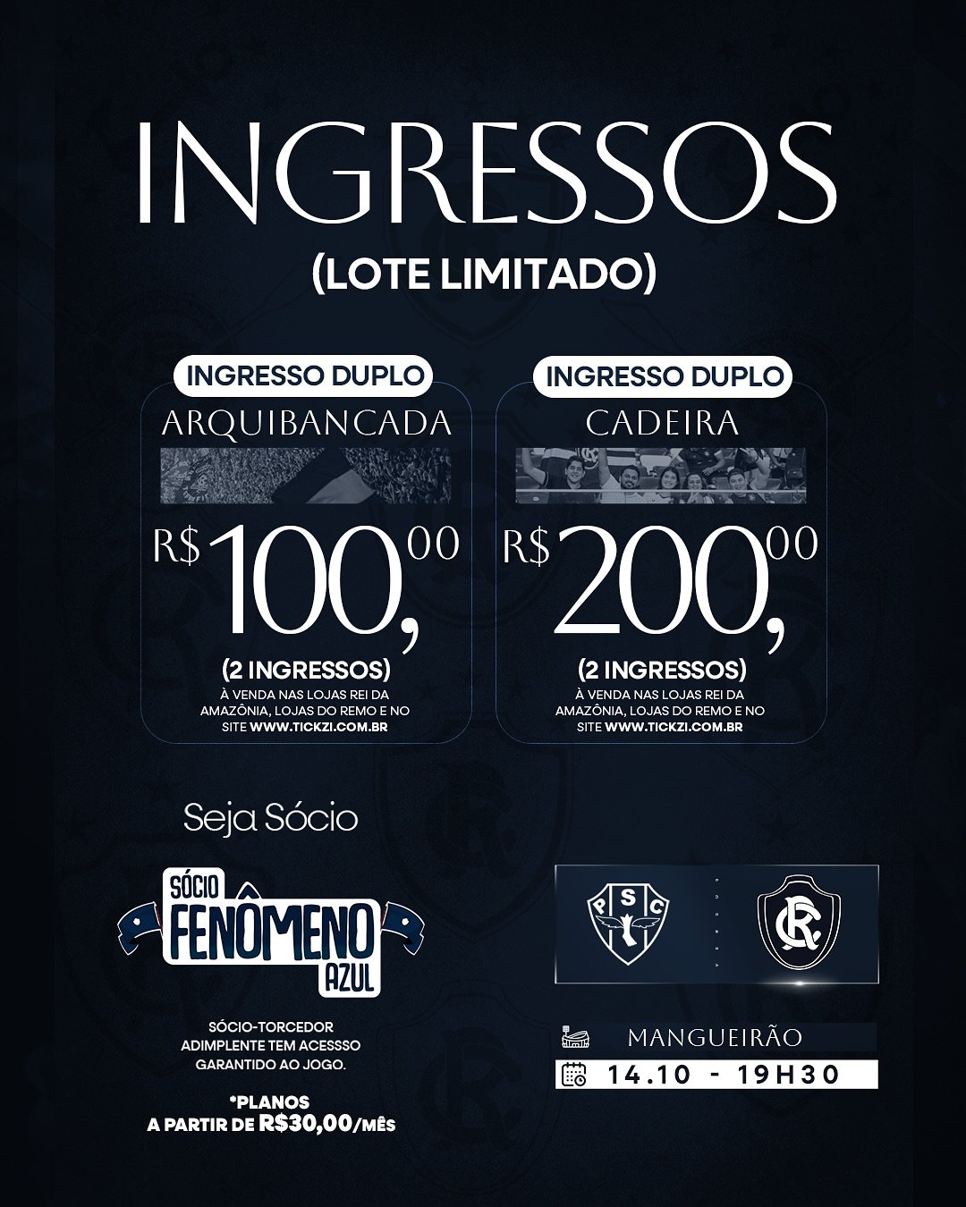 O Clube do Remo anunciou nesta sexta-feira (10) o início da venda de ingressos para o aguardado clássico Re-Pa contra o Paysandu, válido pela Série B do Campeonato Brasileiro. O duelo está marcado para a próxima terça-feira (14), em Belém, e promete lotar as arquibancadas em mais um encontro histórico entre os maiores rivais da Amazônia.