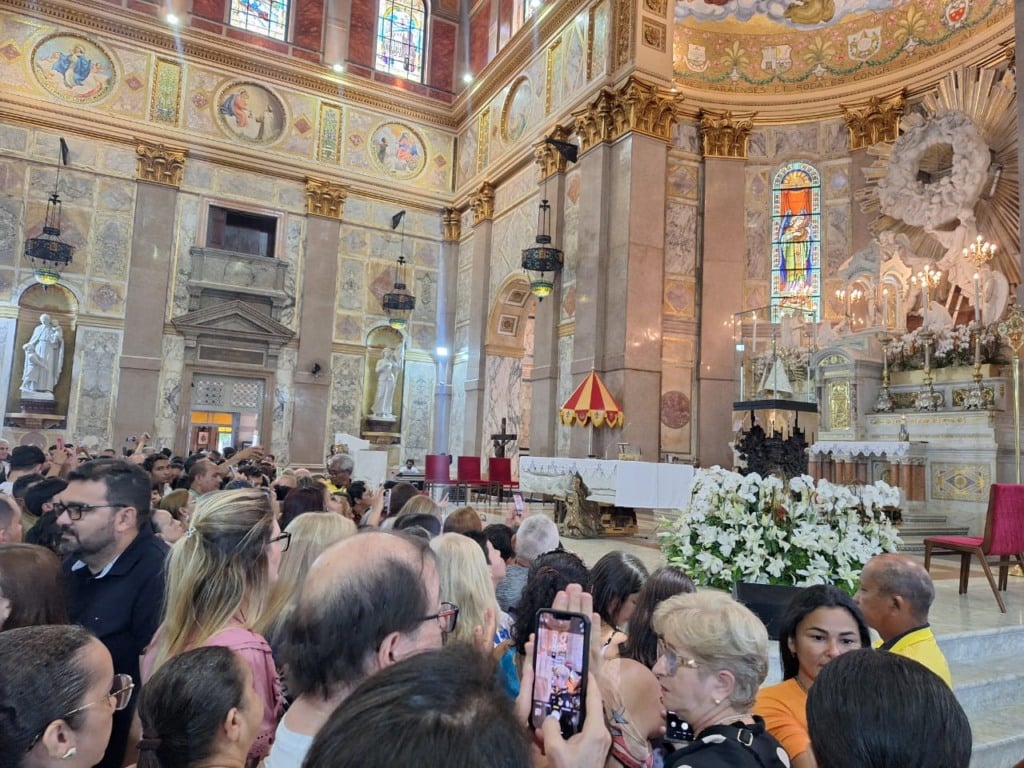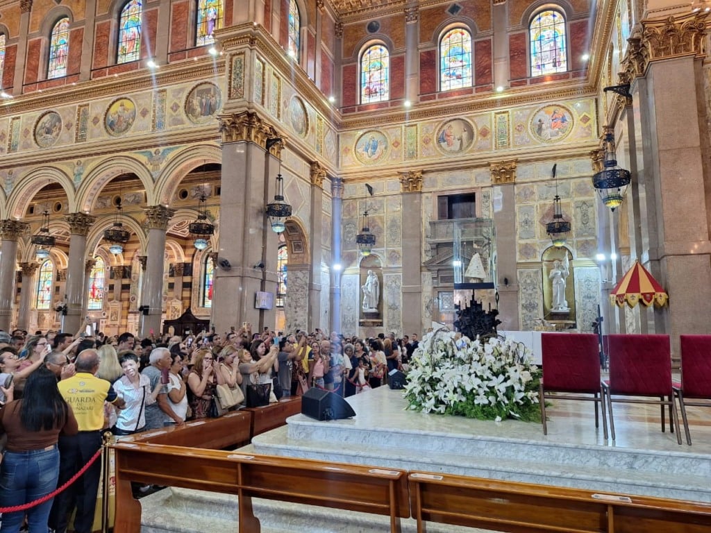 Na manhã desta segunda-feira (13), dezenas de fiéis lotam o altar-mor da Basílica Santuário para ver a Imagem Original de Nossa Senhrora de Nazaré, descida do Glória no último sábado (11), véspera do Círio.