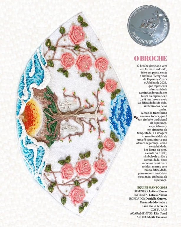 A cerimônia de apresentação será nesta quinta-feira, 9 de outubro, após a missa na Basílica Santuário de Nazaré, presidida por Dom Júlio Endi Akamine, arcebispo metropolitano de Belém. Mais do que um símbolo, o manto é uma oração bordada. Ele precisa traduzir o tema do Círio, evangelizar por meio da beleza e reforçar a devoção à Virgem de Nazaré com cores e adornos que falam direto ao coração paraense.