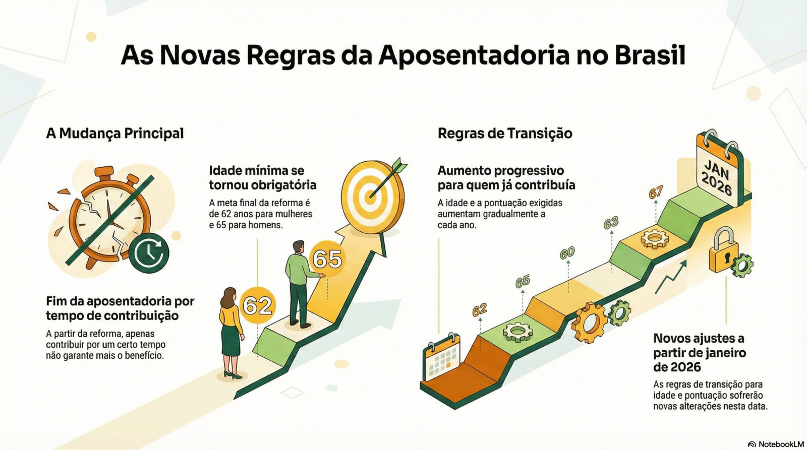 Na primeira mudança, a reforma estabelece um cronograma de transição que prevê o aumento da pontuação exigida para que o beneficiário consiga se aposentar, pontuação esta que é composta pela soma da idade do trabalhador e dos anos de contribuição ao INSS. Em 2025, para que adquirissem o direito à aposentadoria, as mulheres precisavam obter uma pontuação mínima de 92 e os homens de 102 pontos. A partir de janeiro deste ano, porém, com a nova regra em vigor, a pontuação exigida aumentou para 93 pontos, no caso das mulheres, e para 103 pontos, no caso dos homens.