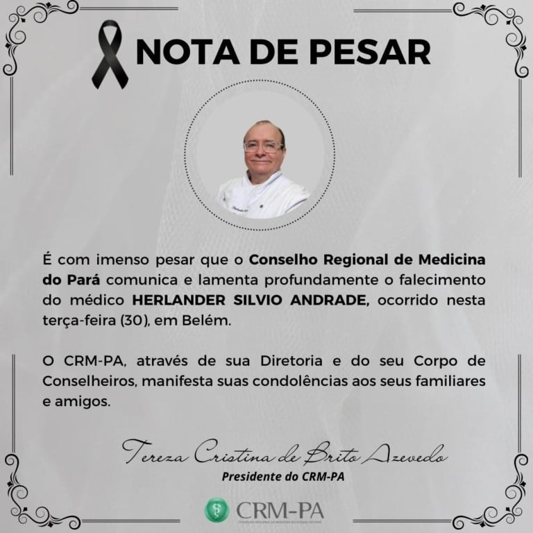 O Conselho Regional de Medicina publicou uma nota nas redes sociais. “É com imenso pesar que o Conselho Regional de Medicina do Pará comunica e lamenta profundamente o falecimento do médico Herlander Silvio Andrade ocorrido nesta terça-feira (30), em Belém“.