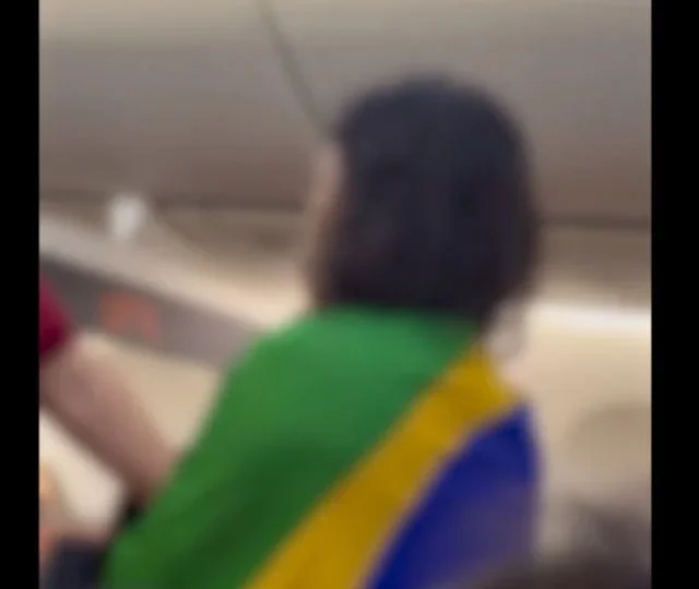 A mulher, enrolada numa bandeira do Brasil, proferiu xingamentos contra outros passageiros, afirmando que “não viaja com petistas” e chamando-os de “estuprador, abusador, aliciador, assediador”.