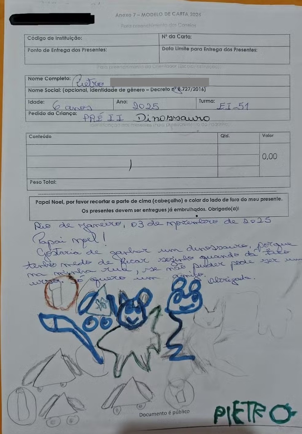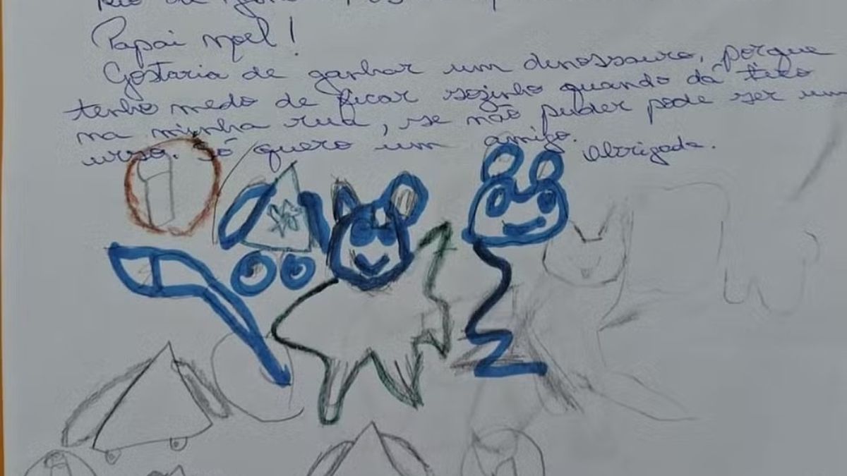 “Gostaria de ganhar um dinossauro, porque tenho medo de ficar sozinho quando dá tiro na minha rua. Se não puder, pode ser um urso. Quero um amigo”, escreveu Pietro. Gabriel, por sua vez, pediu: