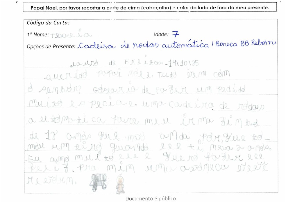 “Querido Papai Noel, gostaria de uma cadeira de rodas automática para meu irmão de 12 anos, que não anda desde que foi atingido por um tiro. Eu o amo muito e quero fazê-lo feliz. Para mim, peço uma boneca bebê reborn.”