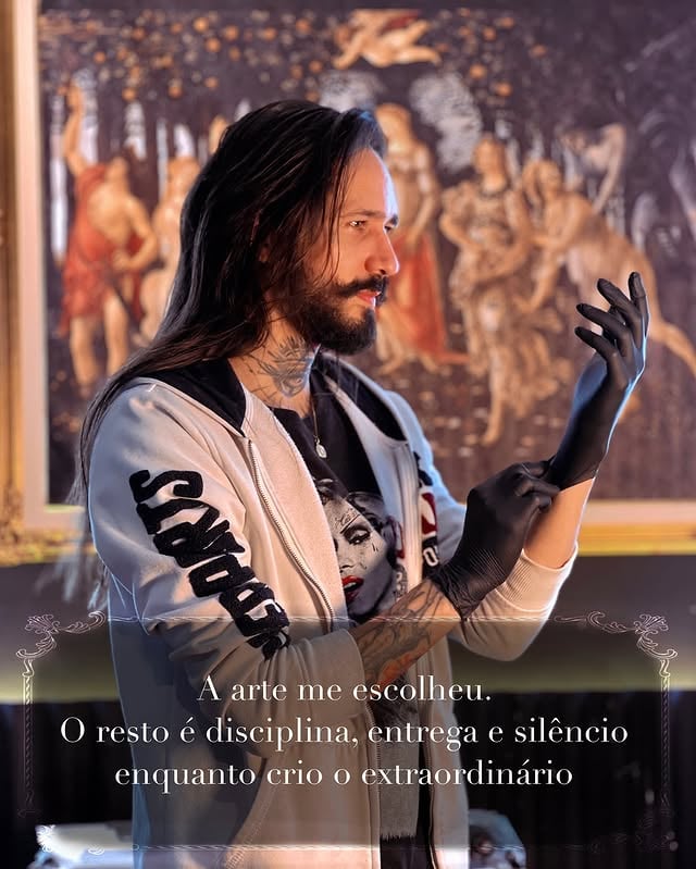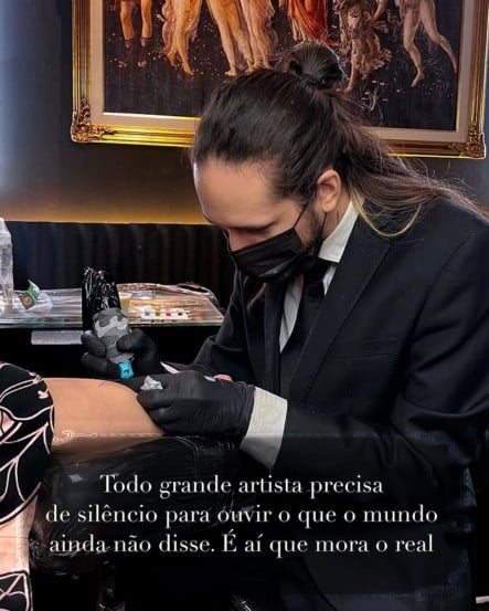 Por trás da tatuagem que viralizou após a polêmica no Palacete Bolonha, está um nome já conhecido no cenário artístico paraense: Dan Quixote. Tatuador e responsável pelo Studio de la Mancha, em Belém, ele se destaca pelo estilo elegante e autoral, que mistura precisão técnica e sensibilidade estética. Nas redes sociais, acumula quase 30 mil seguidores no Instagram e apresenta um portfólio marcado por linhas finas, composições simbólicas e um olhar cuidadoso sobre cada detalhe.