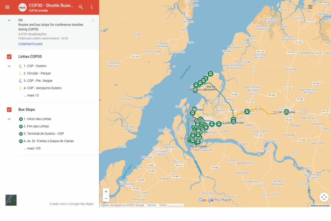 Mais informações sobre como funcionará o sistema de transportes para a COP30 podem ser obtidas aqui. No site é possível consultar, inclusive, um mapa digital de transporte, disponibilizado pelo Governo do Brasil, e que mostra a distribuição das linhas e pontos de parada do sistema de ônibus da COP30 em detalhes, além dos pontos exatos de embarque e desembarque para as demais modalidades de transporte.