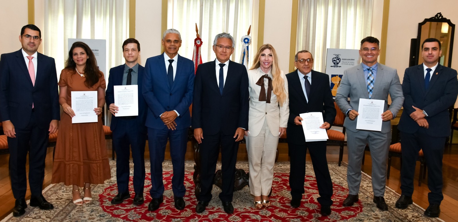 O TJ-PA promoveu mais cinco juízes e juízas para a 3ª Entrância na última terça-feira. Foram empossados os(as) juízes(as) Manoel Antônio Macedo (4ª Vara Cível e Empresarial de Marabá); José Maria Campos e Silva (Vara Única de Curuçá); Aline Cristina Martins (3ª Vara Cível e Empresarial de Marabá), que também representou o juiz Caio Marco Berardo (Vara de Execução Penal de Marabá); e Claytoney Ferreira (Vara de Fazenda Pública e Execução Fiscal de Santarém), representando pelo juiz Silvio César Maria. Na solenidade, o presidente do TJPA disse que a promoção é um compromisso permanente com a garantia da prestação jurisdicional e que os avanços na carreira ocorrem para aprimorar o atendimento à sociedade.