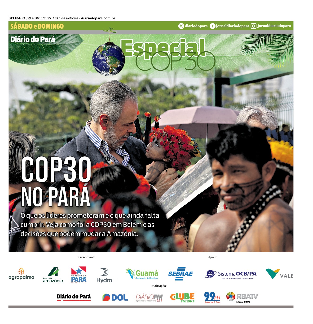 O DIÁRIO DO PARÁ publica neste sábado um caderno especial dedicado à COP30, reunindo tudo o que foi discutido ao longo das duas semanas de eventos realizados em Belém. A edição traz um panorama completo dos principais destaques, propostas, acordos e encaminhamentos que marcaram as agendas climáticas mais importantes do período.