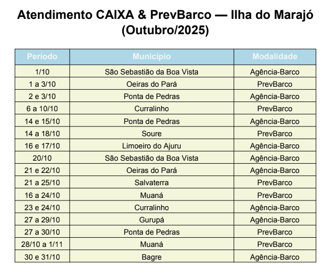 A Agência-Barco Ilha de Marajó já está na região fazendo atendimento para os moradores. Nesta quarta, 1º, a população de São Sebastião da Bela Vista está recebendo atendimento. A agência prossegue pelos municípios locais até o final do mês. Assim como ocorreu em setembro, os moradores também poderão realizar os atendimentos no PrevBarco, em uma parceria da CAIXA com o INSS permitindo que os moradores de 10 municípios do Marajó tenham atendimento por meio das duas embarcações: a Agência-Barco e o PrevBarco