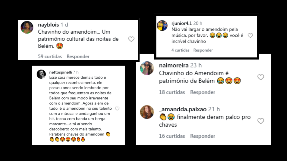 Outro reforçou o carinho do público: “Esse cara merece demais todo e qualquer reconhecimento. Ele passou anos sendo lembrado por todos que frequentam as noites de Belém com seu modo irreverente com o amendoim. Agora, além de tudo, é o amendoim no seu talento com a música”. Teve ainda quem pediu: “Não vai largar o amendoim pela música, por favor. Você é incrível, Chavinho”.