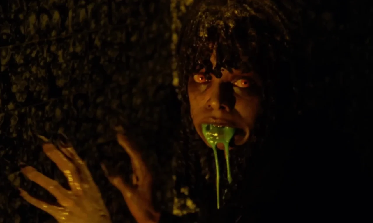 Esse caráter metalinguístico do longa gera uma identificação imediata do público com os seus personagens. Trata-se de um grupo de pessoas que recebe um folheto, distribuído por um sinistro homem de preto com uma máscara de metal que cobre parcialmente o seu rosto, com um convite para uma sessão em um antigo cinema recentemente restaurado. O grupo assiste a um filme de terror e tudo o que acontece na tela é reproduzido na vida real, causando uma possessão demoníaca e sua propagação a partir do contato: mordidas, lacerações, pústulas, banhos de sangue etc. Algo nos moldes de “Evil Dead”, uma clara inspiração, o que justifica o estilo visceral – e galhofeiro – sobrepondo-se ao onírico em vários momentos.